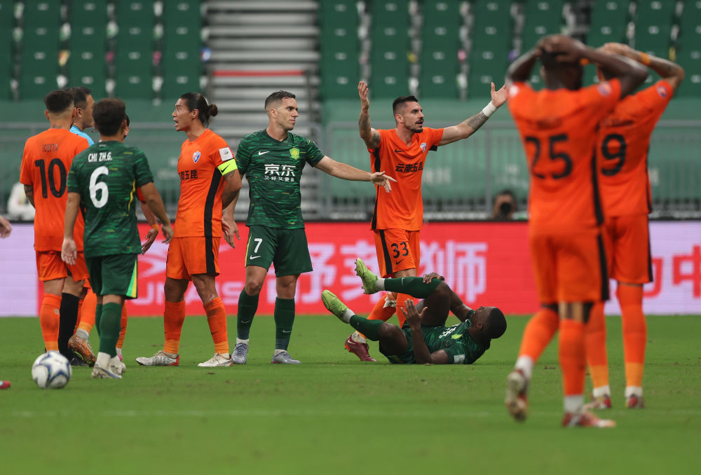8月20日,云南玉昆队球员布尔克(右四)在被裁判出示红牌后。他对北京国安队球员法比奥(下)犯规。新华社记者 胡星宇 摄