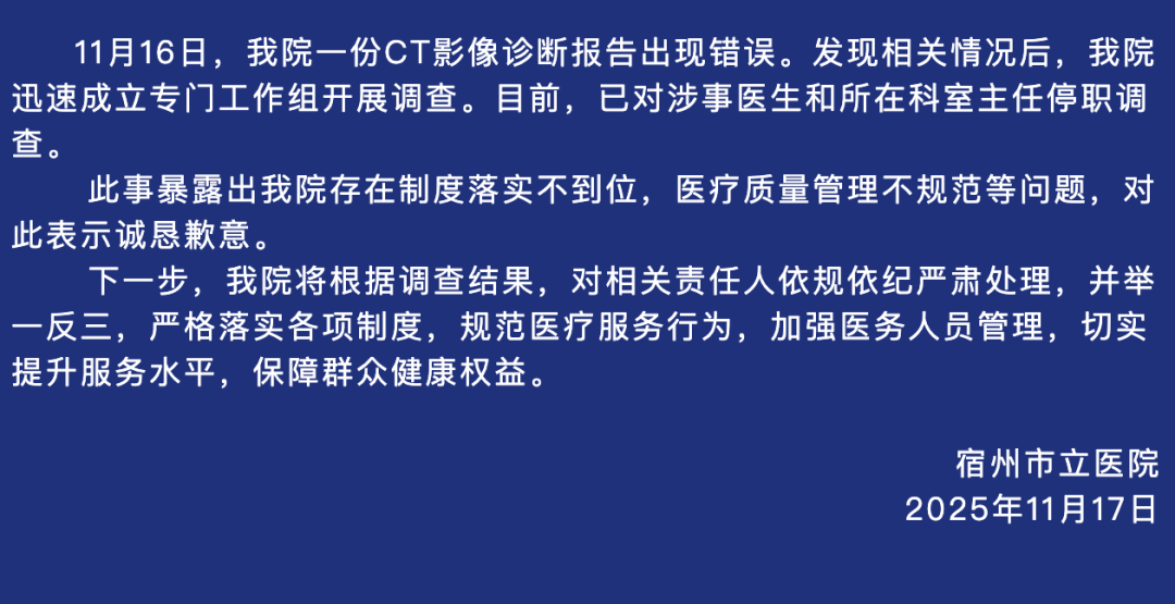 11月17日晚,安徽宿州市立病院发布情况通报: